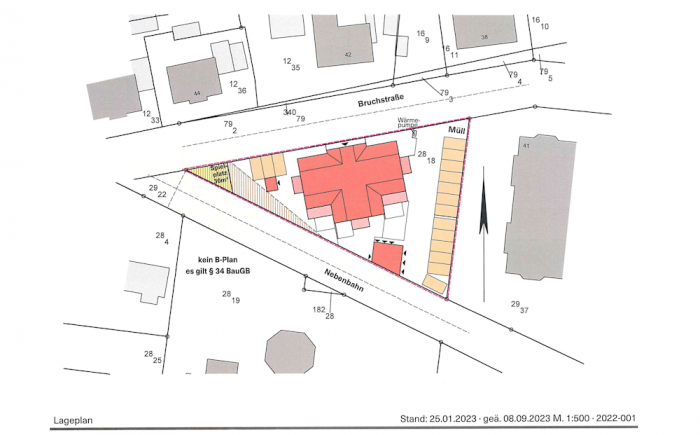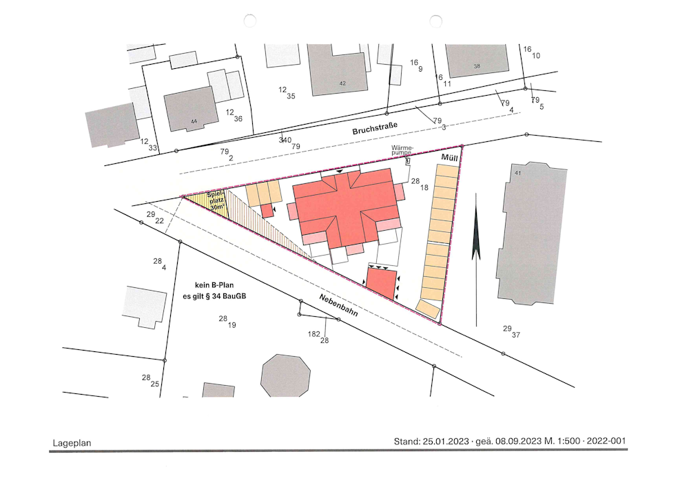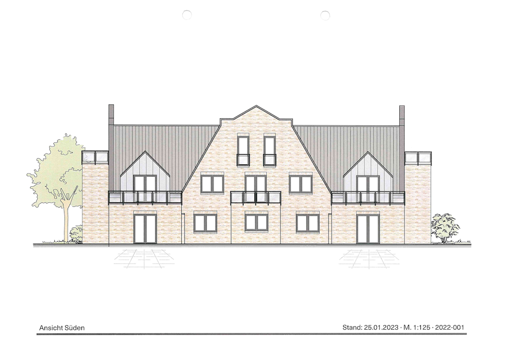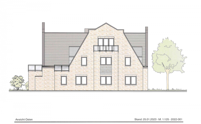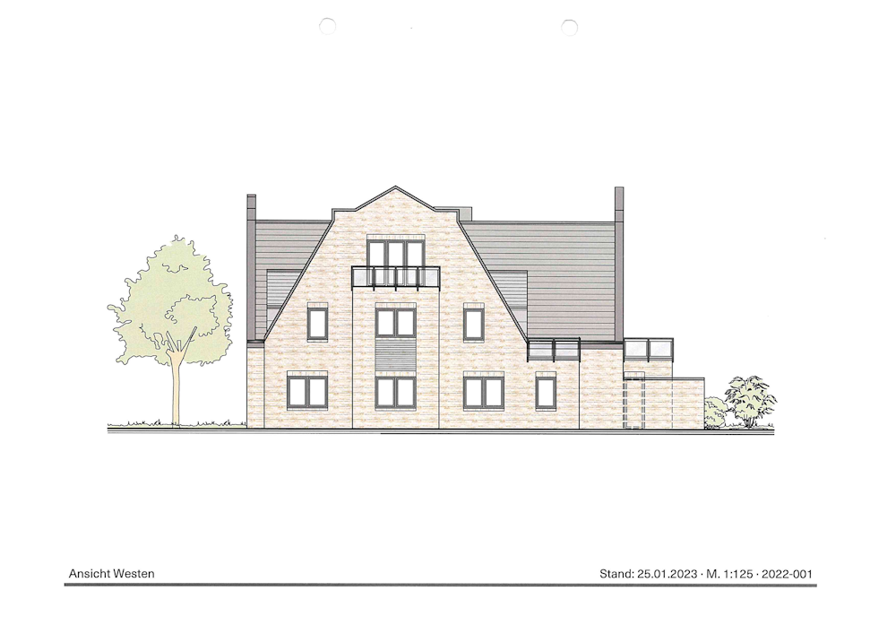 Wohnhaus mit Satteldach und Flachdachanteil. Außenfassade verklinkert, Außentüren und Fenster aus Kunststoff. Heizungsanlage als Luftwasser-Wärmepumpe. Das Objekt verfügt über einen Aufzug.